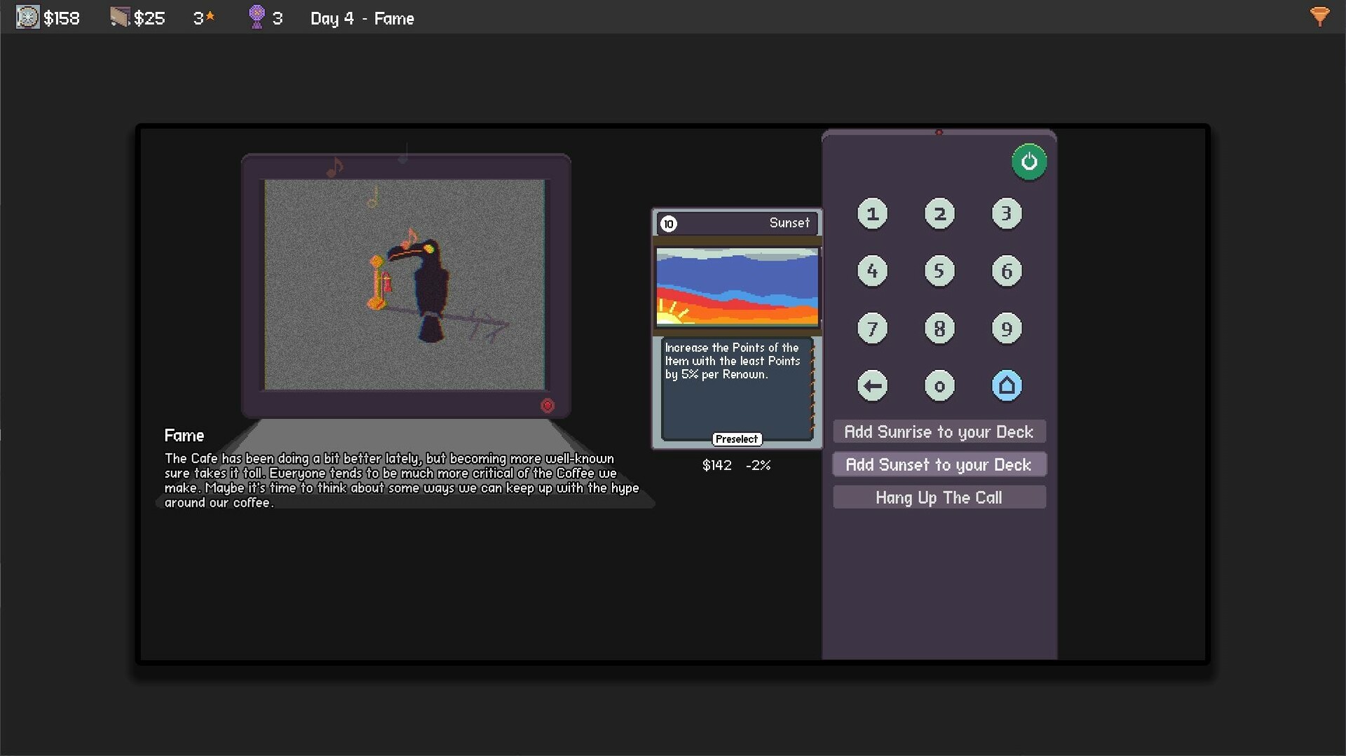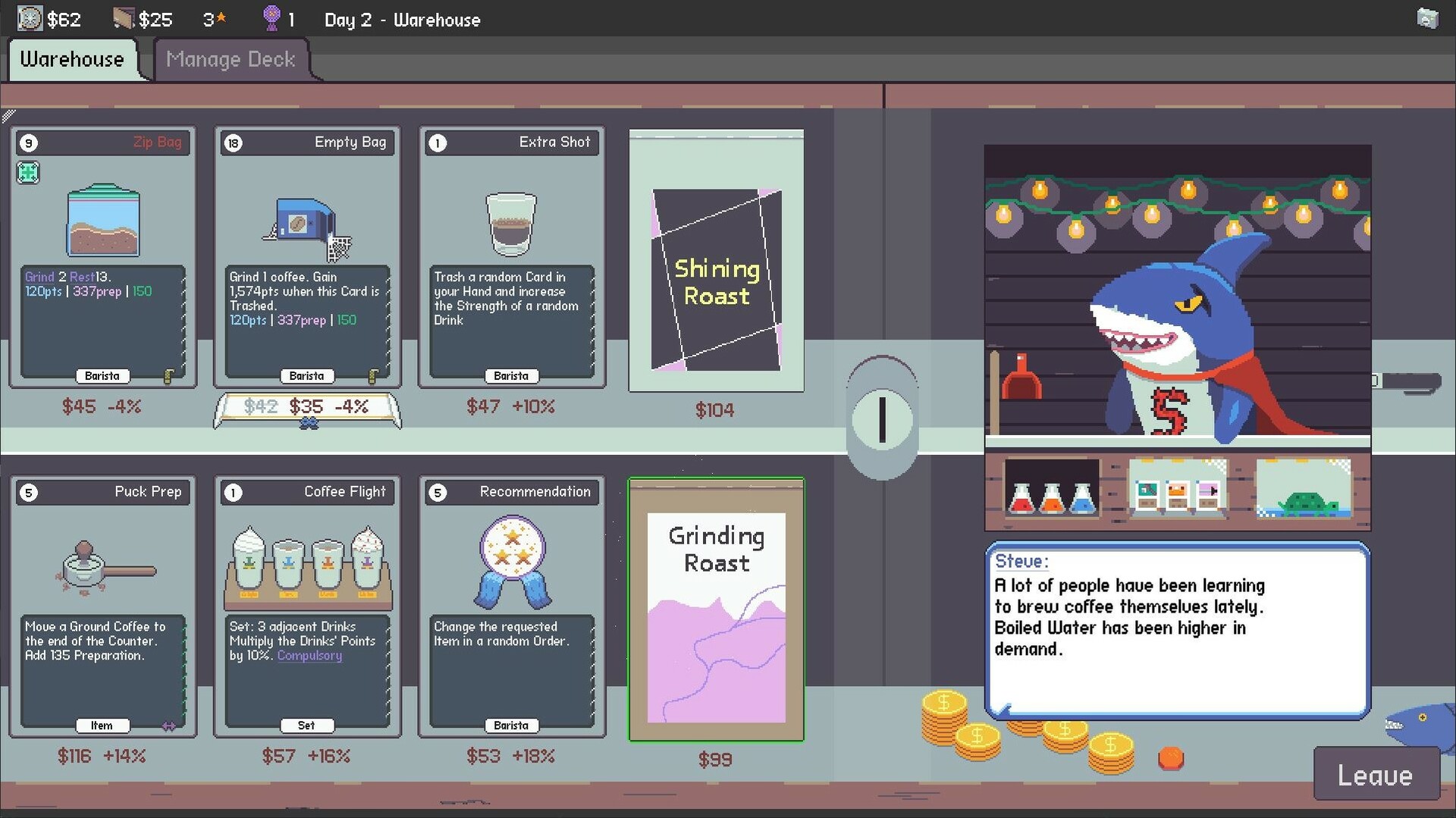 Percolator is a Roguelite Deckbuilder where you manage an up and coming cafe. Brew coffee and juggle a counter of items while scheduling tasks for your Baristas. Reinvest your profits to power up or build wealth. Discover new ways to combine ingredients so that your name goes down in history!CREATE BARISTA SCHEDULESNo more waiting until you have ten Mana! In Percolator, Cards cost time. Play your strongest Cards right away if you want, or don't. It's up to you!You have an unlimited amount of time each day, but your Customers grow more impatient as the day drags on. Do your best to balance making tasty coffee and keeping your customers satisfied.MANAGE YOUR COUNTERYour Counter is the cornerstone of your Cafe. As you create Items to serve to your Customers, they will go onto your Counter. The placement of Items on your Counter is important! So make sure to always consider not only when to play Cards, but where your Items should end up.MASTER THE BREWMany Items have Traits that grant special powers. Take advantage of the Brewing System to craft together different Items and combine their Traits! Explore thousands of combinations to find the playstyles that suit you. KEEP YOUR CUSTOMERS HAPPYEvery day brings new challenges... Your customers always have new demands and expect you to improve your game! Adapt your strategy to constantly changing orders and ensure that you get those five star ratings!BUILD YOUR EMPIREChase the dream of being a successful cafe. Carefully manage your profits and decide the best way to reinvest them. Power up your deck, purchase new equipment, or even dabble in the card market. Your dream cafe awaits - go get it!ABOUT THE DEVGames have always been my escape, a constant grounding force, and a way I connect with some of my best friends. From Hearthstone, to League of Legends, Stardew Valley, and countless others, a variety of games have helped to shape who I am today.I became a developer to continue passing that forward. My goal is to design experiences that feel fresh, with mechanics that invite deep strategy and replay-ability. I hope that my games can become a meaningful part of other peoples' lives.
